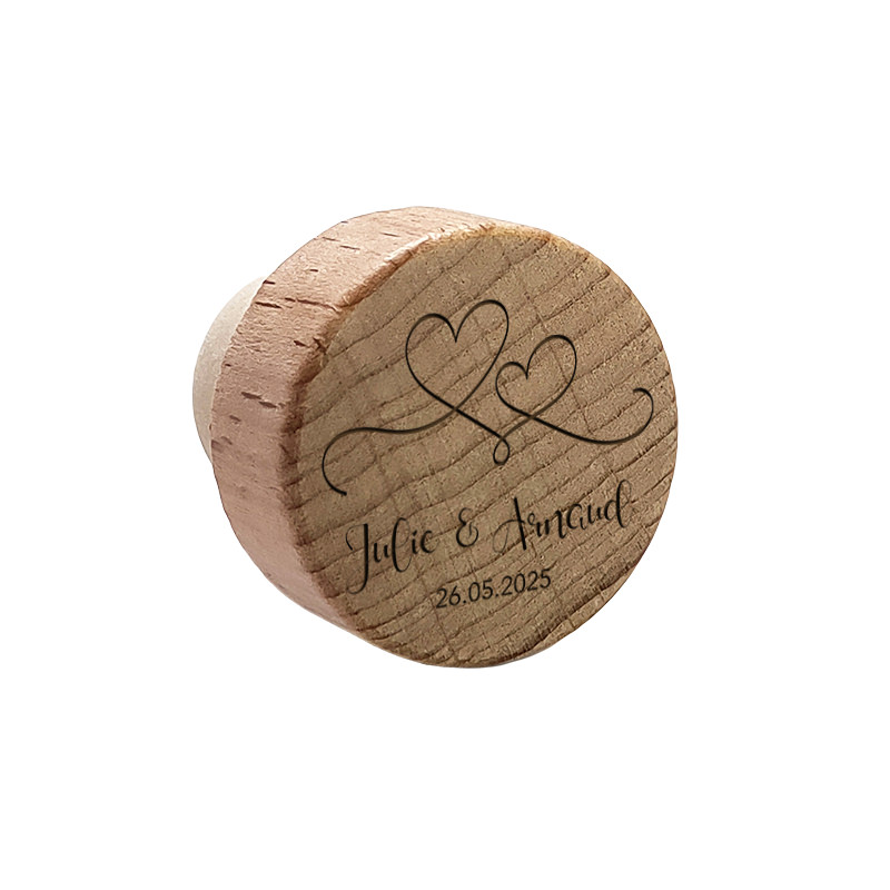 Offrez un bouchon de bouteille en bois gravé sur-mesure : idéal pour un mariage, un événement ou un cadeau d’entreprise.