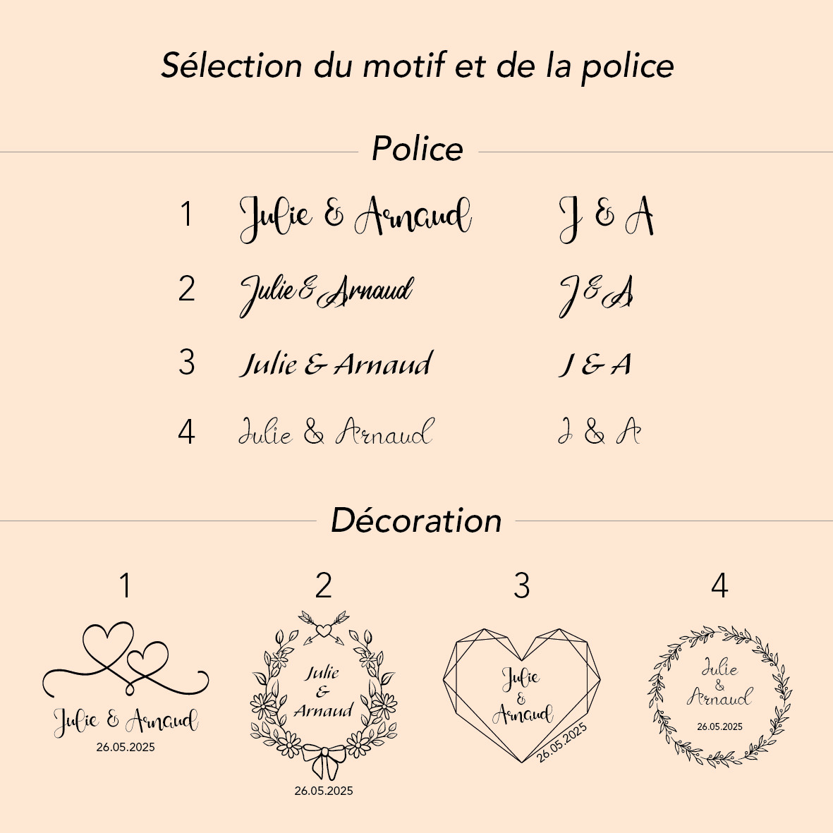 Ce bouchon est personnalisable avec un motif parmi nos modèles de mariage ou avec votre propre fichier vectorisé fourni (logo, illustration, message personnel). Il est aussi possible de nous fournir un fichier image.