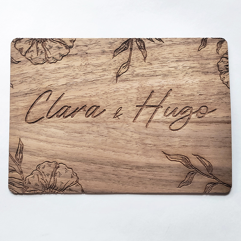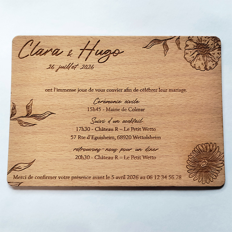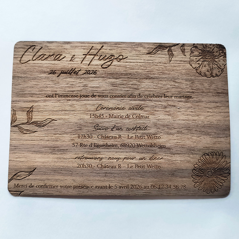 Annoncez votre mariage avec élégance grâce à un faire-part en bois finement gravé, personnalisable et 100% artisanal.