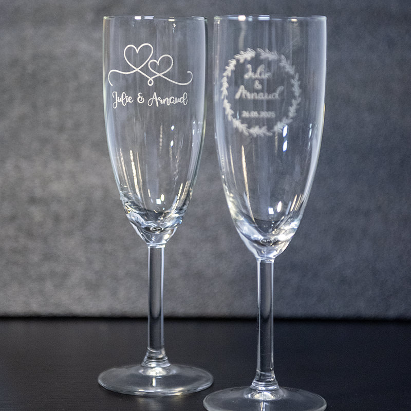 Offrez un verre à champagne personnalisé et gravé au laser, idéal pour un mariage ou un événement spécial. Noms, date, motifs et polices au choix pour un cadeau élégant et unique.